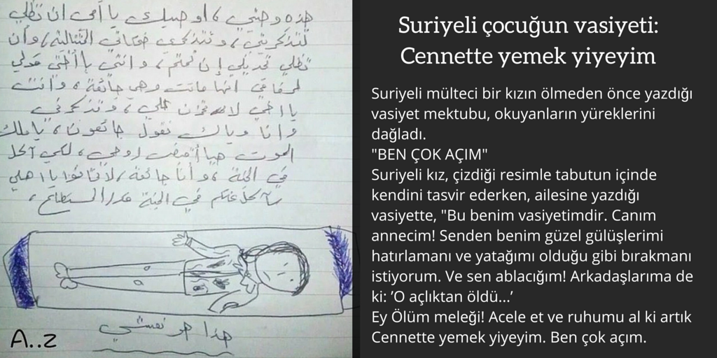 Suriyeli çocuğun vasiyeti. Geçtiğimiz haftalarda türkiye yi kurtarıcı olarak gösteren suriyeli çocuğun resminin ardından yine suriyeli küçük bir kızın. Suriyeli çocuklar yaşadıkları büyük acıları yazıya ve resimlere dökerek feryatlarını dünyaya duyurmaya çalışıyor. Cennette yemek yiyeyim suriyeli mülteci bir kızın ölmeden önce yazdığı vasiyet mektubu okuyanların yüreklerini dağladı. Küçük kız ölüm meleğine canımı alk ki cennet te yemek yiyeyim diye seslendi.